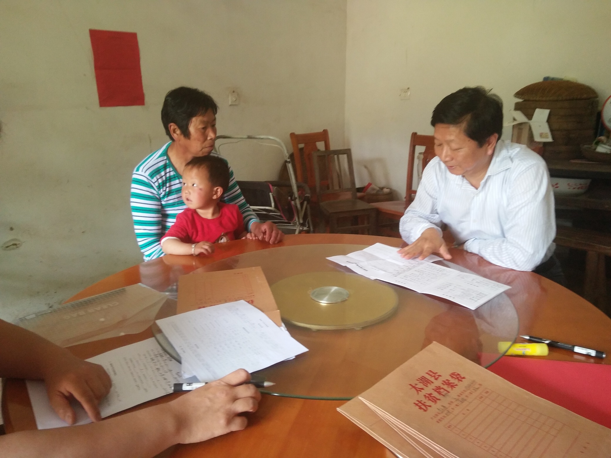 随后深入贫困户家中进行走访。通过拉家常的方式从 贫困户家庭组成、基本生活资料情况、从事产业和可支配性收入情况,健康、教育和社会保障、帮扶落实、对帮扶工作满意度等几方面进行了深入了解。在江卫华家中,谈到之子江智目前在安庆某汽车修理公司学习汽车修理技术,刘主任针对当前扶贫政策,提出能否通过就业培训一些相关政策给予补助或者奖励。得知李文革户因患肾衰竭,每周需要透析3次,到100多公里的太湖县城,虽报销力度大点,但路途非常不方便,考虑到坐车及吃住等问题,选择了毗邻20多公里的湖北省英山县医院,就目前健康扶贫的范围仅针对本省才享受政策,那享受的政府补助力度要大打折扣。刘主任与同行的县、镇干部进行沟通交谈,能否与相关部门沟通,在山区也设立一个透析点,这样就切实解决了这个问题,所有山区的贫困户也都能得实惠。